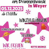Herzliche Einladung an die Weyerer Bürger. Wir stehen in der Ortsmitte am Dorfbrunnen, und freuen uns auf euer kommen. Wir machen für Euch Fränkische Bratwürste und Winzerglühwein. Bitte bringe Deine Tasse mit!!!